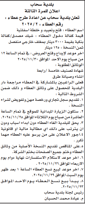 عطاء فتح وتعبيد خلطات اسفلتية لشوارع بلدية سحاب