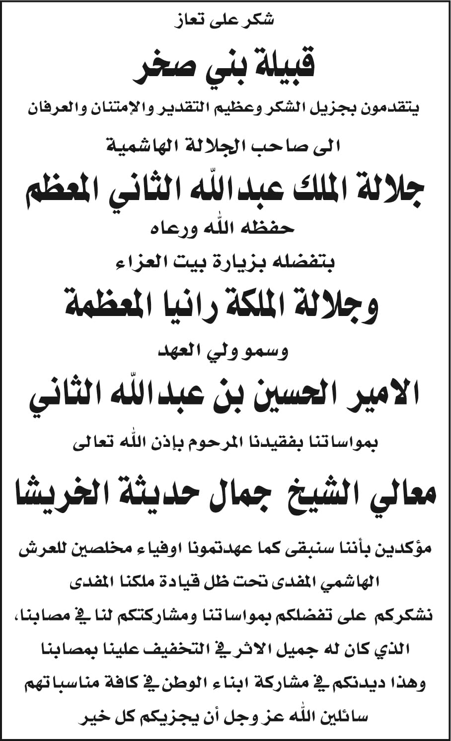 عمون - تتقدم قبيلة بني صخر بجزيل الشكر وعظيم التقدير والإمتنان والعرفان إلى صاحب الجلالة الهاشمية جلالة الملك عبد الله الثاني المعظم حفظه الله ورعاه بتفضله بزيارة بيت العزاء، وجلالة الملكة رانيا المعظمة، وسمو ولي العهد الأمير الحسين بن عبد الله الثاني. |