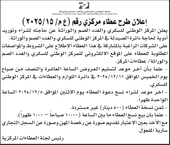 عطاء شراء أدوية للمركز الوطني للسكري