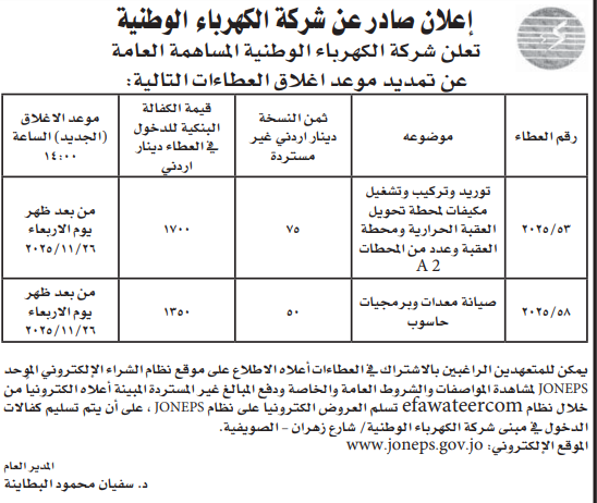 عطاءات صادرة عن شركة الكهرباء الوطنية