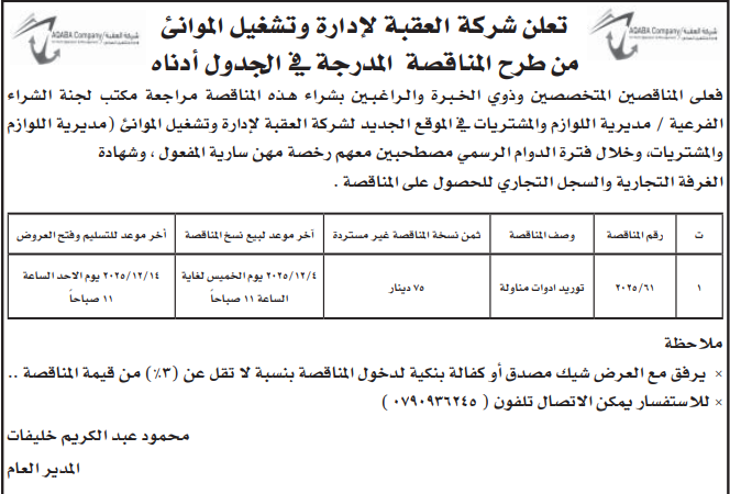 عطاء صادر عن شركة العقبة لادارة وتشغيل الموانئ