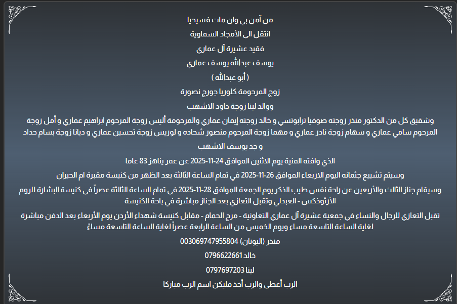 وسيقام جناز الثالث والأربعين عن راحة نفس طيب الذكر يوم الجمعة الموافق 28-11-2025 في تمام الساعة الثالثة عصراً في كنيسة البشارة للروم الأرثوذكس - العبدلي وتقبل التعازي بعد الجناز مباشرة في باحة الكنيسة