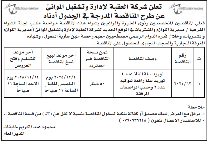 عطاء صادر عن شركة العقبة لادارة وتشغيل الموانئ