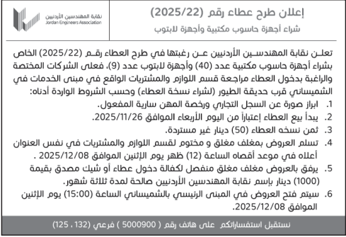 عطاء صادر عن نقابة المهندسين الاردنيين