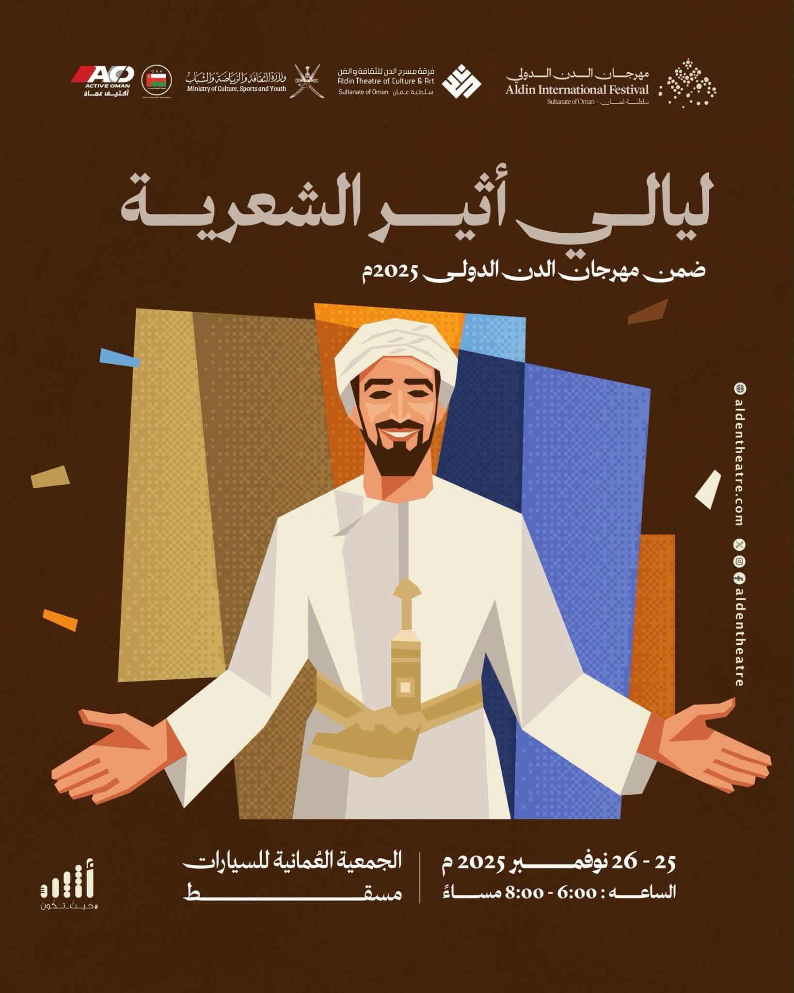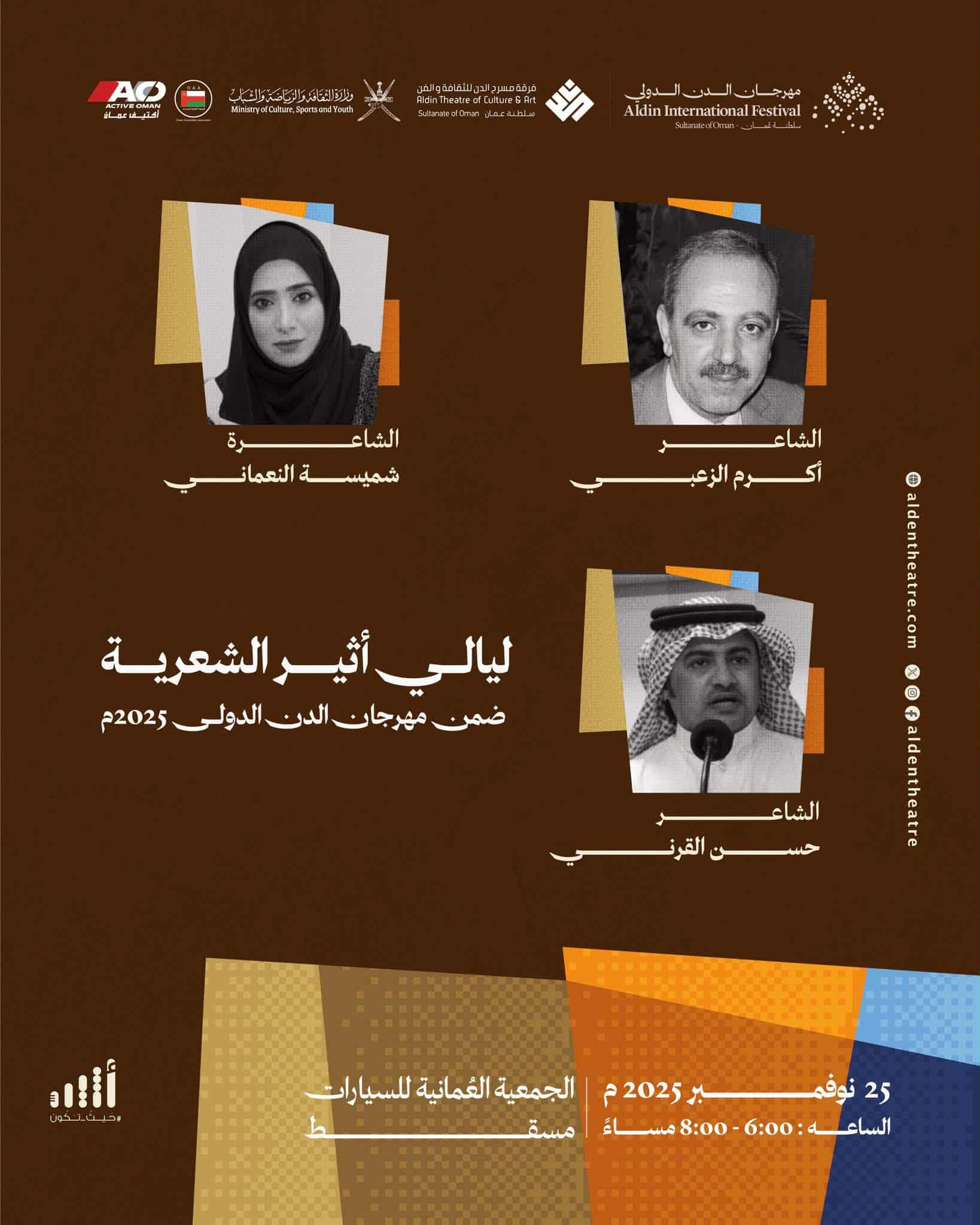 عمون - مسقط - في أمسية مليئة بالشعر الإنساني والوجداني لاقت استحسان وتفاعل الجمهور، وبمناسبة احتفالات السلطنة بأعيادها الوطنية أقيمت ليلة أمس في العاصمة العمانية مسقط أمسية شعرية ضمن ليالي أثير الشعرية في مهرجان الدن الدولي شارك فيها الشعراء حسن القرني من السعودية، وأكرم الزعبي من الأردن، وشميسة النعماني من سلطنة عُمان.