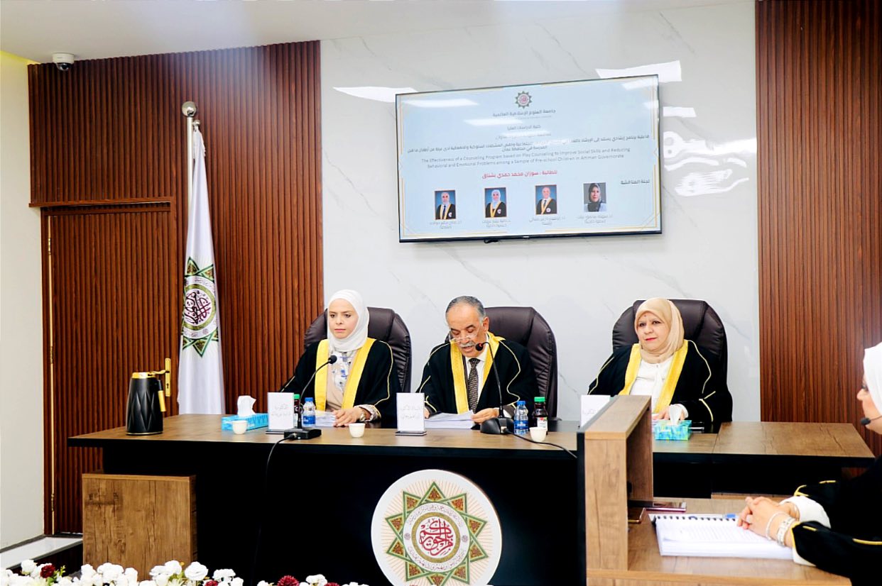 وذلك ضمن لجنة المناقشة المشكلة برئاسة الأستاذ الدكتور إبراهيم معالي وعضوية الاستاذ الدكتور سهيلة بنات وبإشراف الأستاذ الدكتور صالح الخوالده، في رحاب جامعة العلوم الإسلامية العالمية المتميزة بدورها في دعم البحث العلمي، وتعزيز المخرجات التعليمية المؤهلة لخدمة الوطن.