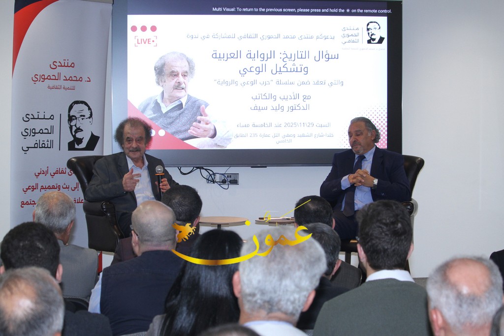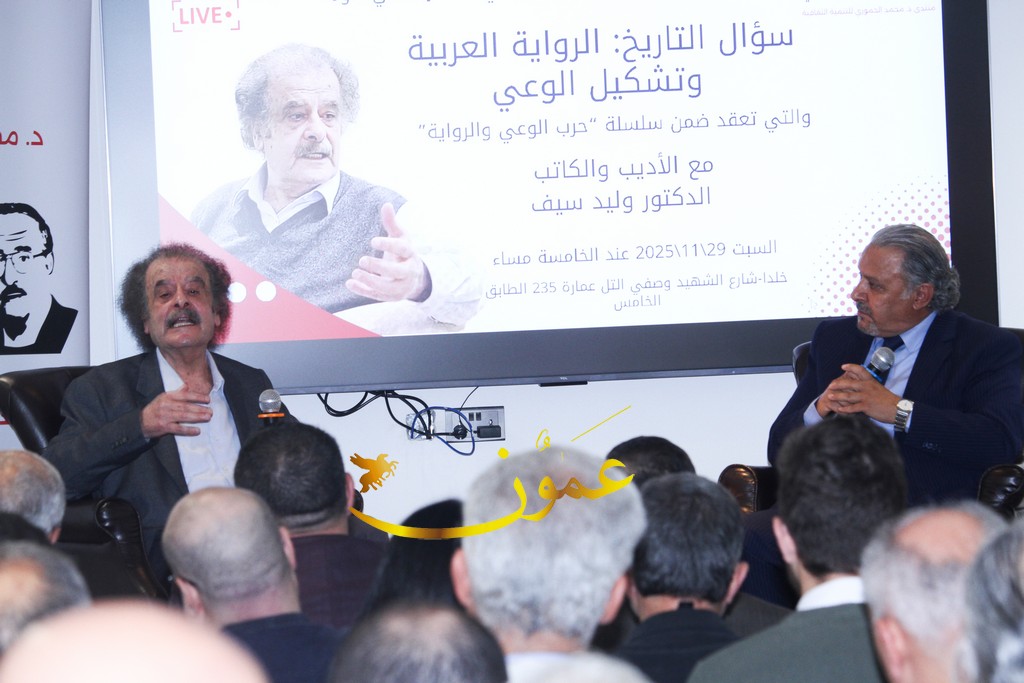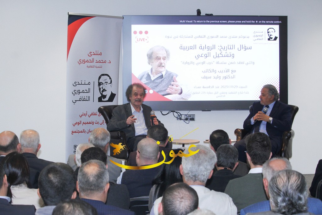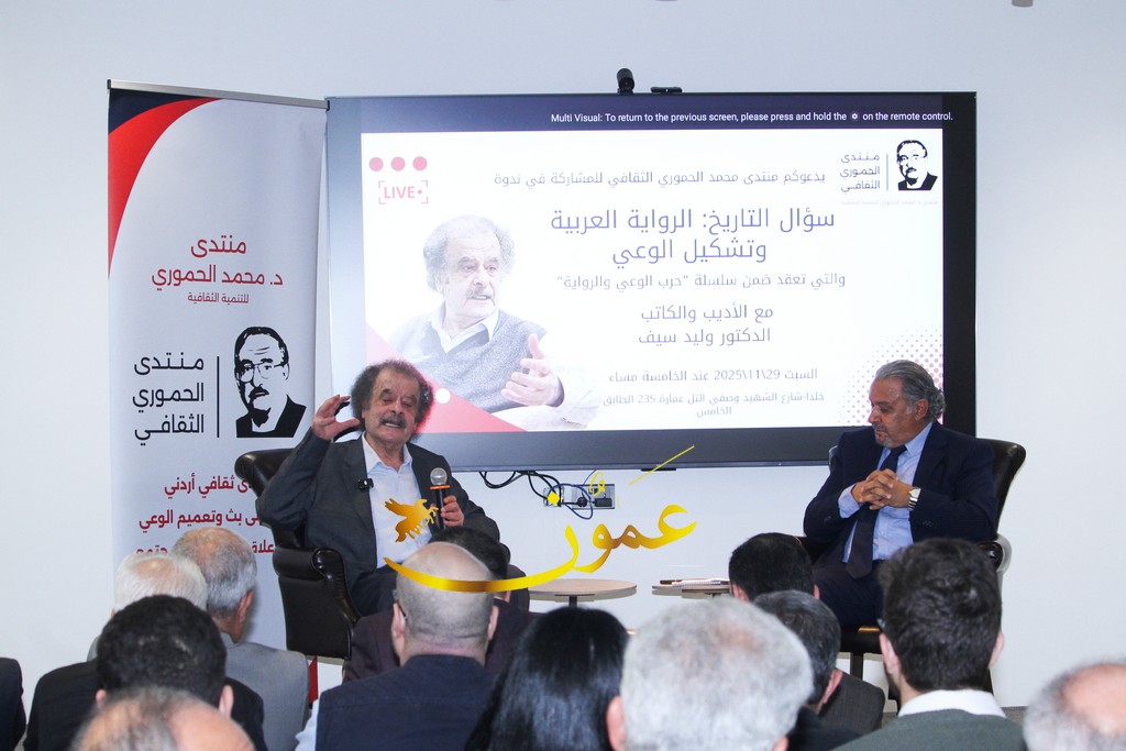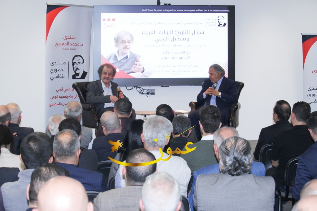 عمون - ضمن سلسلة حرب الوعي والرواية، نظّم منتدى محمد الحموري للتنمية الثقافية، مساء أمس، ندوة بعنوان "سؤال التاريخ: الرواية العربية وتشكيل الوعي" قدّمها المفكر والكاتب الدرامي الدكتور وليد سيف، وسط حضور من المثقفين والمهتمين بالشأن الفكري والأدبي.