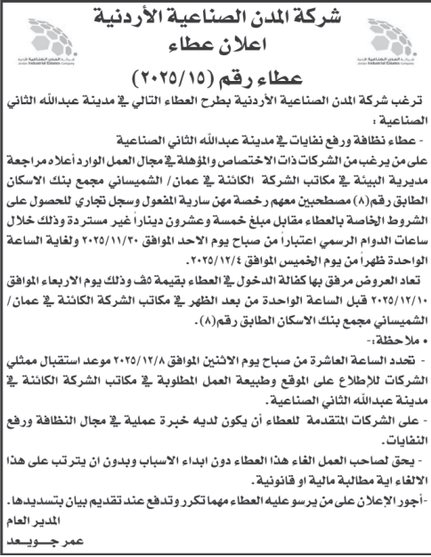 عطاء صادر عن شركة المدن الصناعية الاردنية