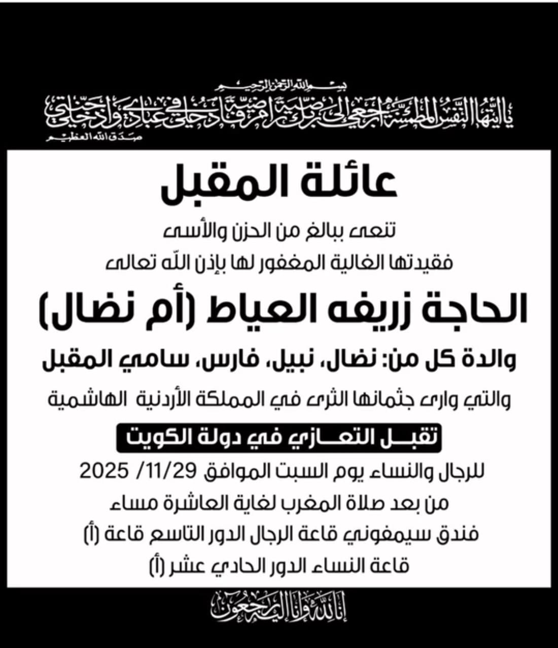 عمون - تنعى عائلة المقبل ببالغ الحزن والأسى فقيدتها المغفور لها بإذن الله