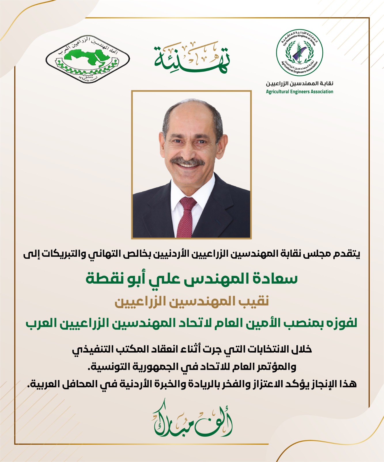 وتتقدم نقابة المهندسين الزراعيين الأردنيين بأصدق التهاني والتبريكات لسعادة النقيب على هذا الإنجاز المستحق، الذي يشكل مصدر فخر واعتزاز للنقابة وللمهندسين الزراعيين الأردنيين جميعا.
