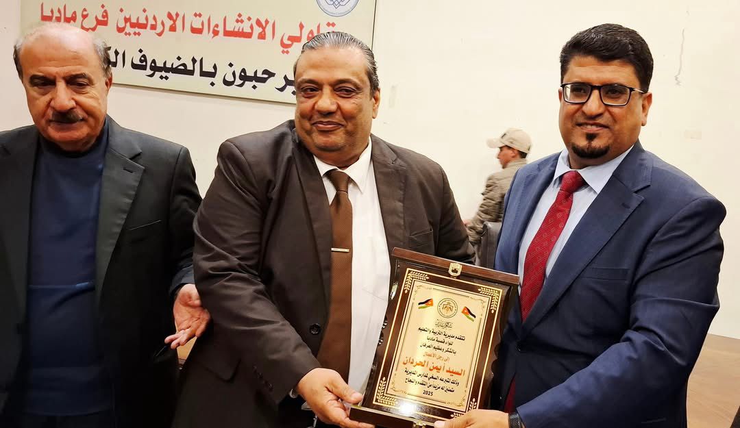 وفي الختام، قام راعي الحفل العين محمد خريبات الازايده ، برفقة مدير أوقاف مادبا ومدير تربية قصبة مادبا ، بتسليم ثلاثة دروع تقديرية مقدمة من مجلس إعمار مادبا ومديرية التربية والتعليم ومديرية الأوقاف تكريمًا لرجل الأعمال أيمن مفلح الحردان.