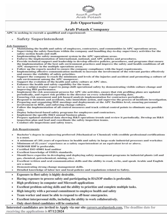 وظيفة شاغرة لدى شركة البوتاس العربية