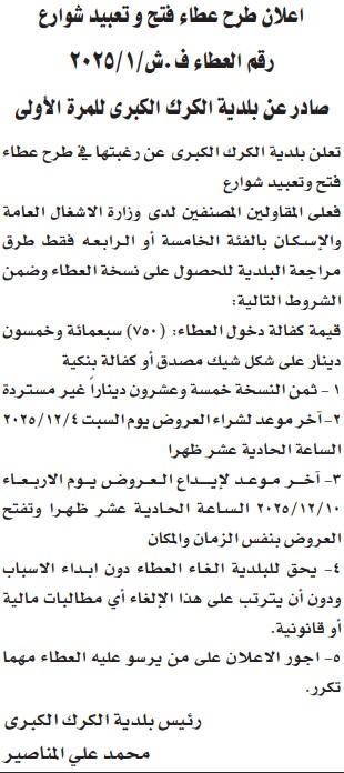 عطاء فتح وتعبيد شوارع لبلدية الكرك الكبرى