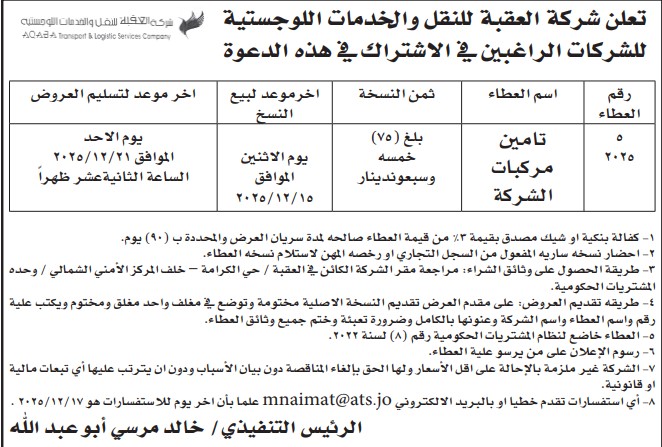 عطاء تأمين مركبات شركة العقبة للنقل والخدمات اللوجستية