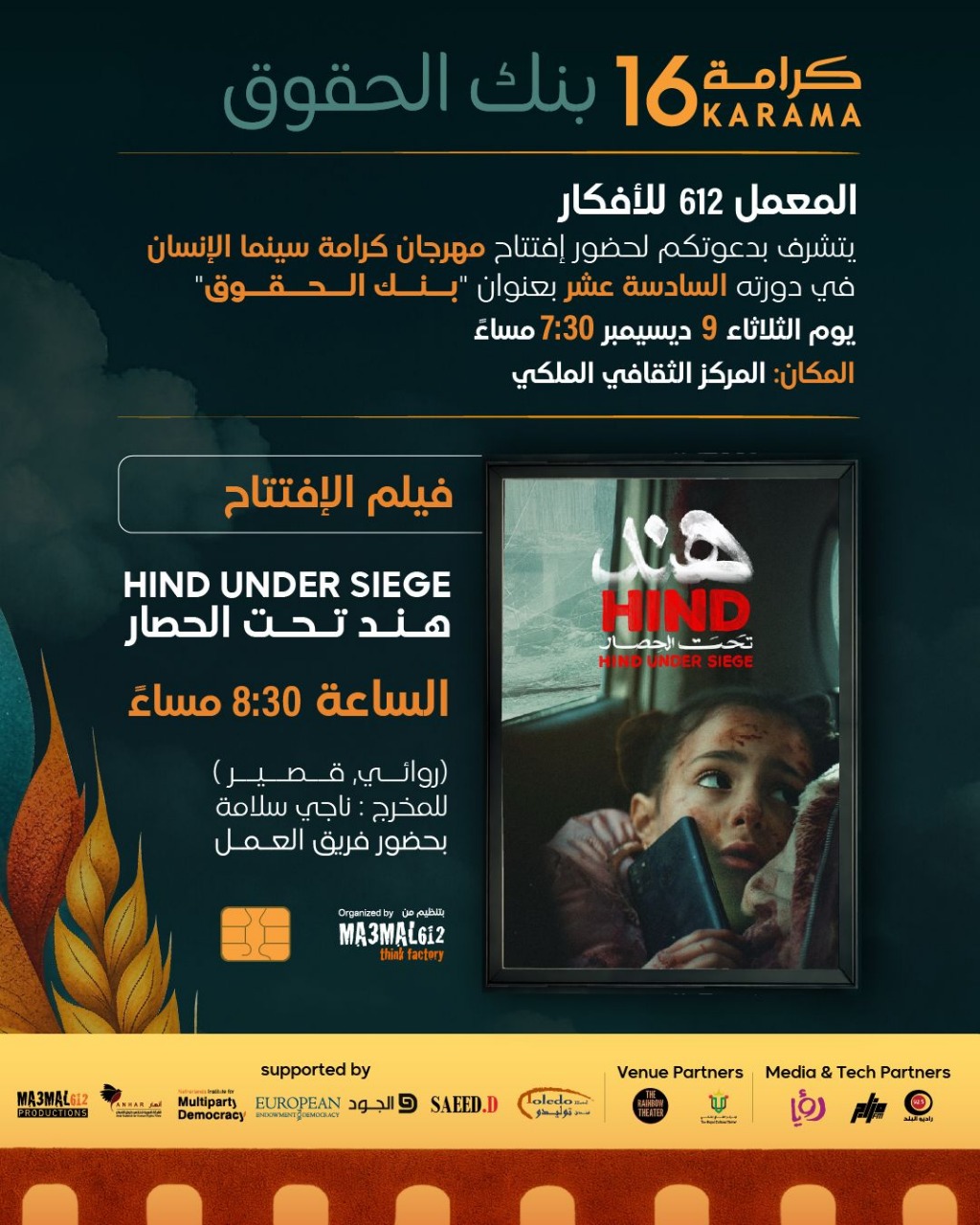 عمون - في مؤتمر صحفي أُقيم أمس الأحد بمقر المعمل 612 للأفكار، أعلن القائمون على مهرجان "كرامة: سينما الإنسان" عن تفاصيل الدورة السادسة عشرة، التي ستُعقد من 9 إلى 14 ديسمبر 2025 في المركز الثقافي الملكي وسينما الرينبو.