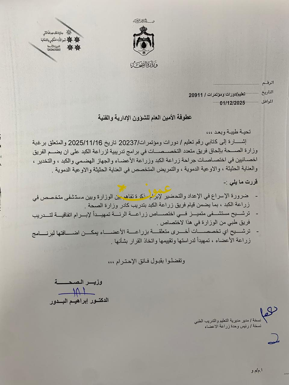 وبحسب الكتاب الذي اطلعت عليه عمون، فإن هذا التوجيه يتعلق في إيفاد فريق طبي متعدد التخصصات إلى برامج تدريبية متقدمة في مجال زراعة الكبد، على أن يضم أخصائيين في جراحة زراعة الكبد وزراعة الأعضاء، والجهاز الهضمي والكبد، والتخدير، والعناية الحثيثة، والأوعية الدموية، إضافة إلى التمريض المتخصص في العناية الحثيثة والأوعية الدموية.
