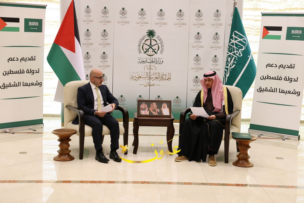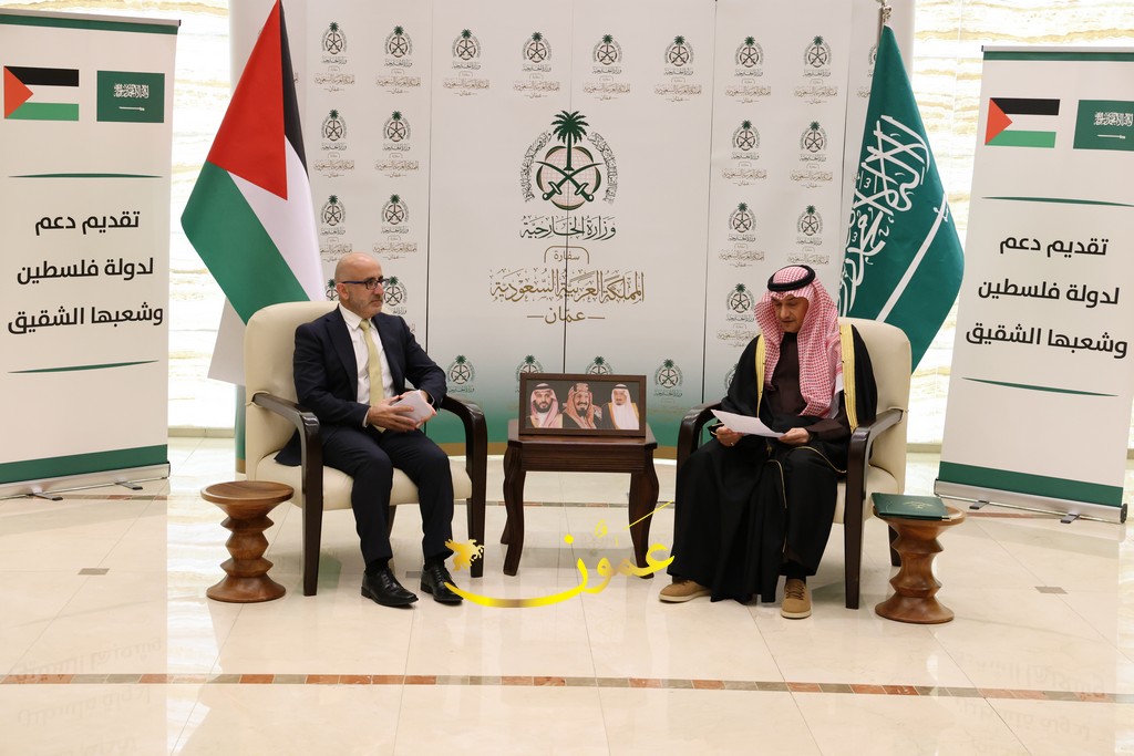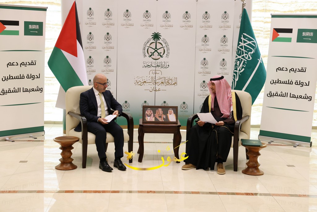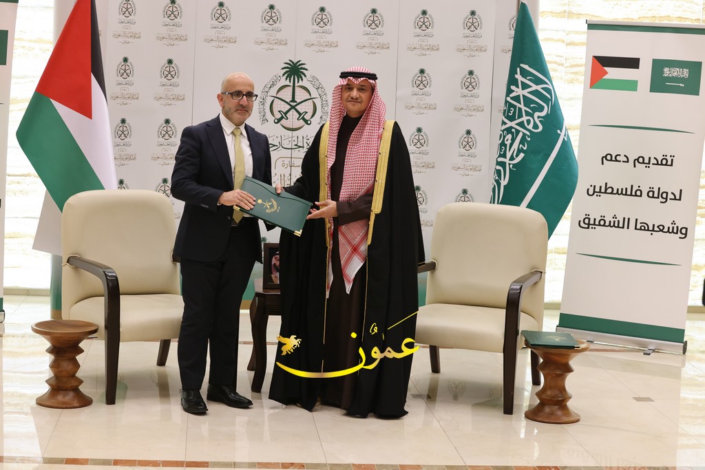 عمون - سلّم سفير خادم الحرمين الشريفين لدى الأردن الأمير منصور بن خالد بن فرحان آل سعود، بمقر السفارة اليوم، وزير التخطيط والتعاون الدولي ومُسَيِر أعمال وزارة المالية في الحكومة الفلسطينية الدكتور اسطفيان سلامة، الدعم المالي المقدم لدولة فلسطين من المملكة العربية السعودية بقيمة 90 مليون دولار، في إطار الدعم السعودي المستمر لدولة فلسطين للعام 2025.