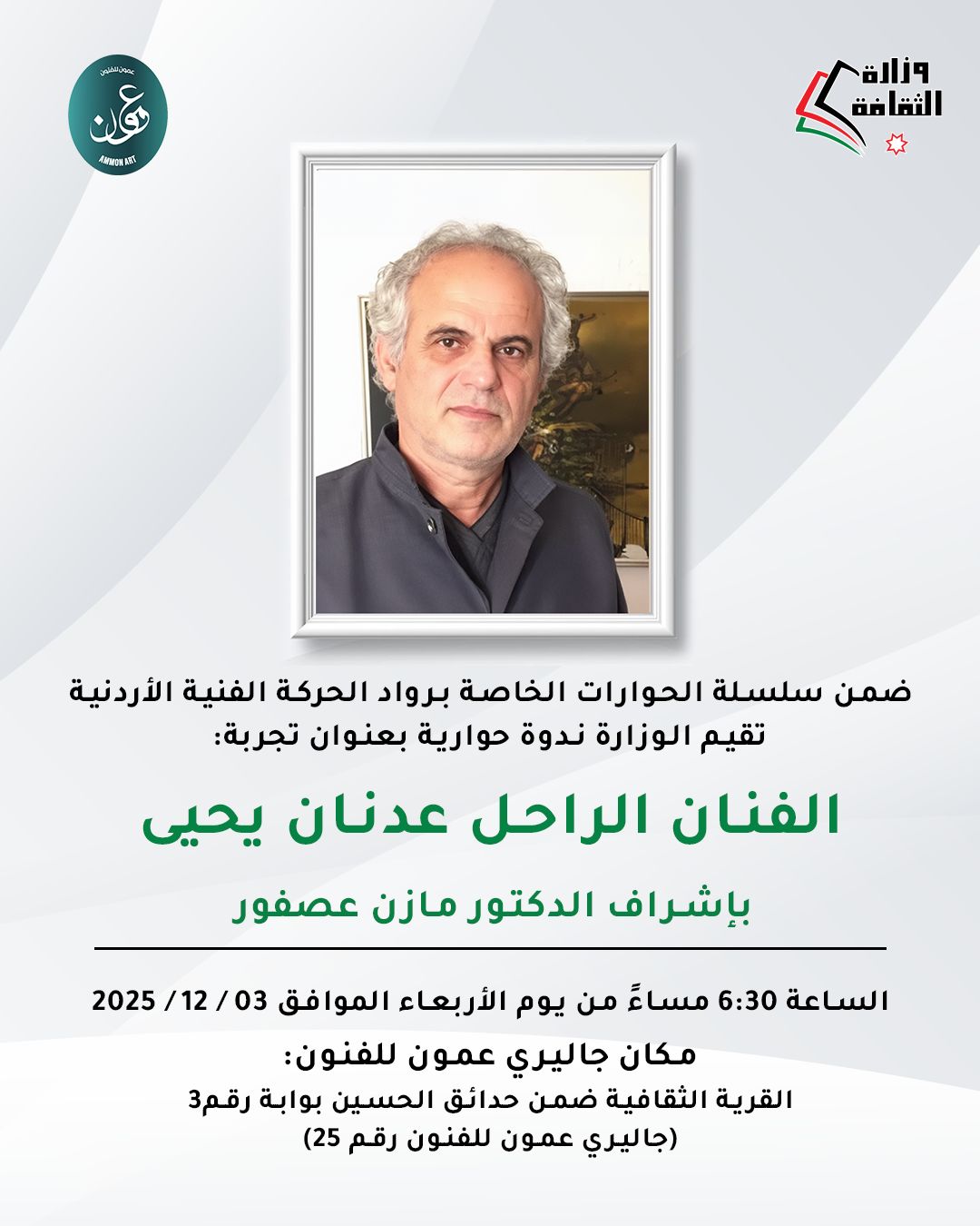 عمون - تستضيف وزارة الثقافة فعالية جديدة ضمن سلسلة الحوارات الفنية المفتوحة الخاصة بالروّاد، والتي تُقيمها الوزارة في إطار سعيها الدؤوب للتعريف بروّاد الفن الأردني، وبناء جسور تواصل بين الأجيال الفنية المختلفة وبوصفها منصة للتوثيق والحوار، واستعادة الذاكرة الجمالية الأردنية حيث يُعقد يوم الأربعاء القادم، الموافق الثالث من ديسمبر، الساعة السادسة والنصف مساءً، في قاعة جاليري عمون للفنون الواقع في القرية الثقافية، حوار فني موسَّع حول تجربة الفنان الراحل عدنان يحيى، أحد أبرز التشكيليين الأردنيين، الذين تركوا بصمة فنية مؤثرة منذ منتصف السبعينيات وحتى رحيله تاركا بصماته المؤثرة في الساحة الفنية المحلية.