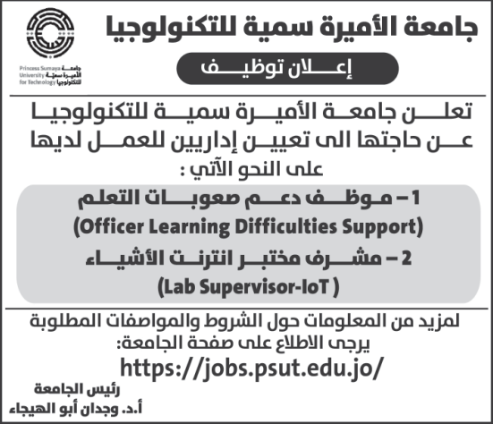 وظائف شاغرة لدى جامعة الاميرة سمية للتكنولوجيا
