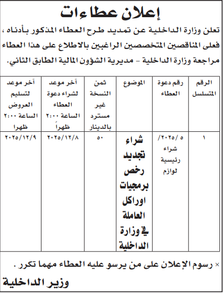 عطاء شراء تجديد رخص برمجيات اوراكل لوزارة الداخلية