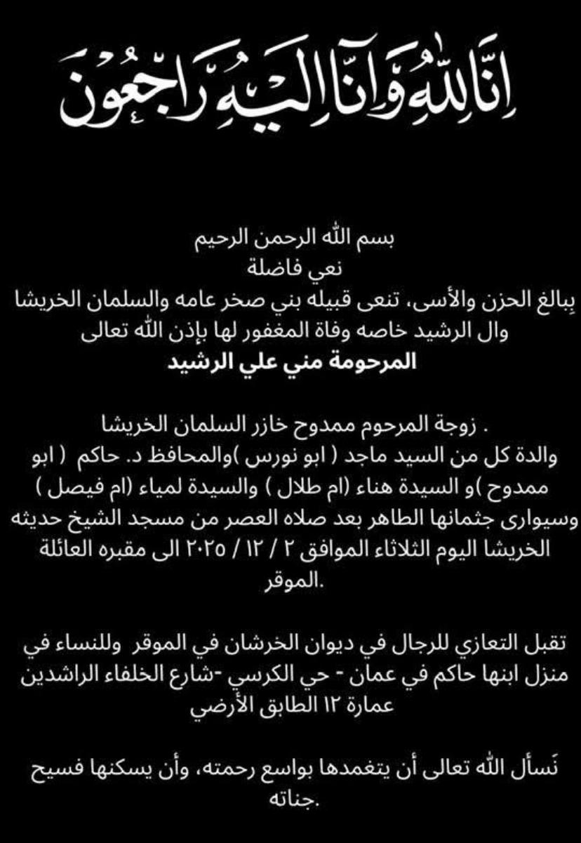 عمون - تنعى قبيلة بني صخر عامة والسلمان الخريشا وآل الرشيد خاصة وفاة المغفور لها بإذن الله تعالى