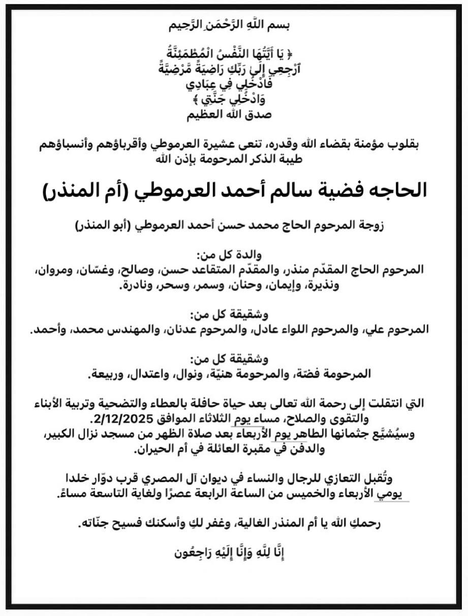 عمون - بقلوب مؤمنة بقضاء الله وقدره، تنعى عشيرة العرموطي وأقرباؤهم وأنسباؤهم طيبة الذكر المرحومة بإذن الله الحاجّة فضية سالم أحمد العرموطي (أم المنذر)