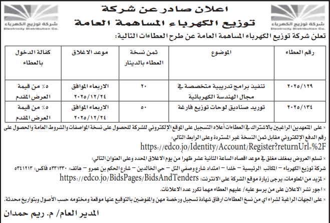 عطاءات صادرة عن شركة توزيع الكهرباء