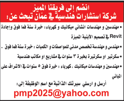 مطلوب مهندسين للعمل لدى شركة استشارات هندسية