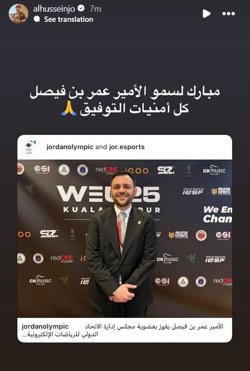 عمون - هنأ ولي العهد سمو الأمير الحسين بن عبدالله الثاني، عبر انستغرام، اليوم السبت، سمو الأمير عمر بن فيصل بفوزه في عضوية مجلس إدارة الاتحاد الدولي للرياضات الإلكترونية. |