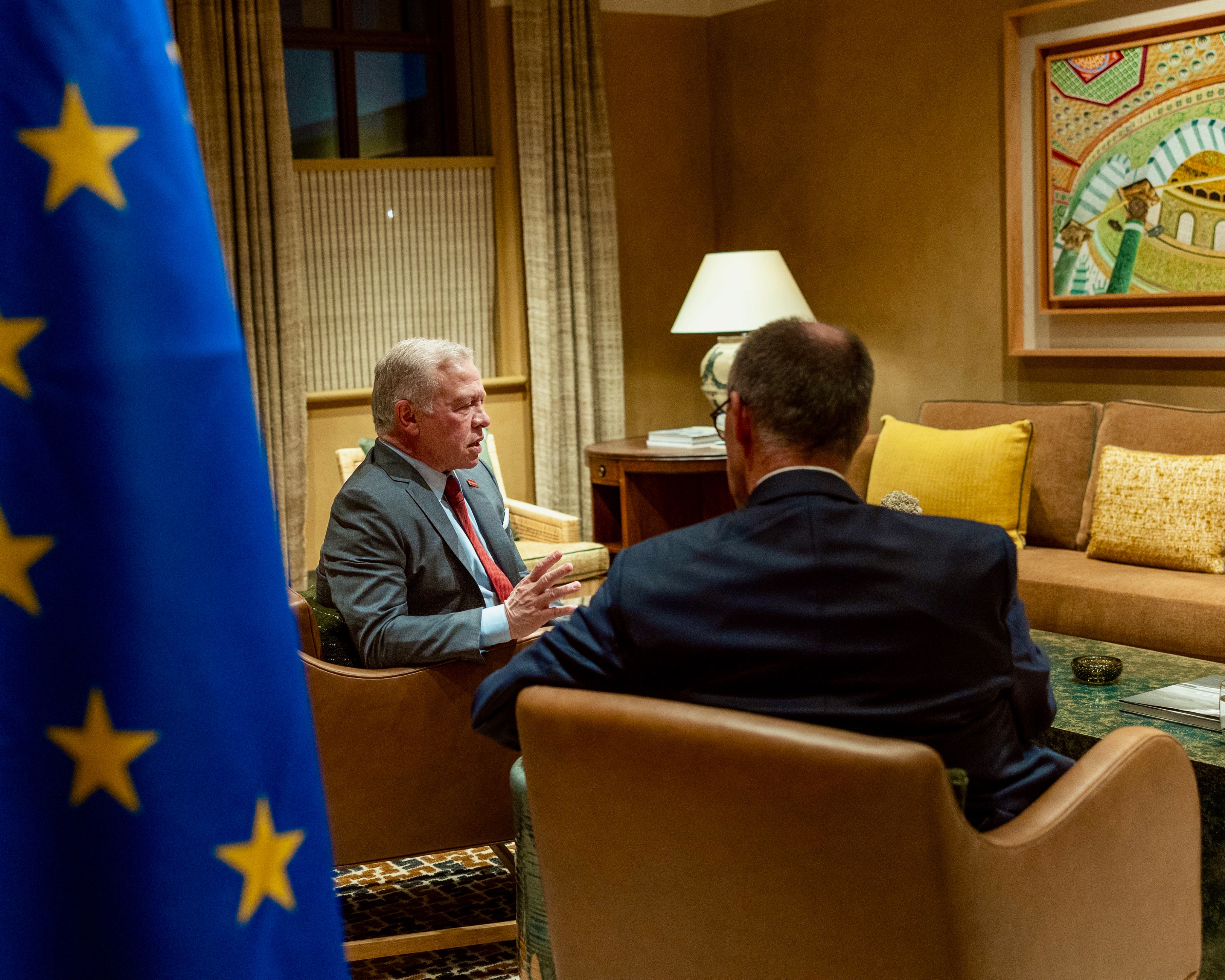 وتناول اللقاء عمق العلاقات الأردنية الألمانية، إذ أكد جلالته الحرص على توسيع التعاون في شتى المجالات، خاصة الاقتصادية والدفاعية، ومواصلة التنسيق لدعم جهود تحقيق الاستقرار في المنطقة.