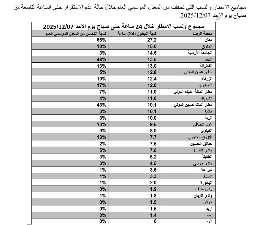 وأفاد آل خطاب انه قد بلغ اعلى مجموع مطري في محطة رصد معان بمجموع مطري بلغ (27.2) ملم بما نسبته 66% من معدلها الموسمي العام، يليها محطة رصد المفرق بمجموع مطري بلغ (15.6) ملم بما نسبته 10% من معدلها الموسمي العام، يليها محطة الجامعة الاردنية بمجموع مطري بلغ (14.5) وبما نسبته 3% من معدلها الموسمي العام، يليها محطة رصد الجفر بمجموع مطري بلغ (13.5) وبما نسبته 48% من معدلها الموسمي العام.