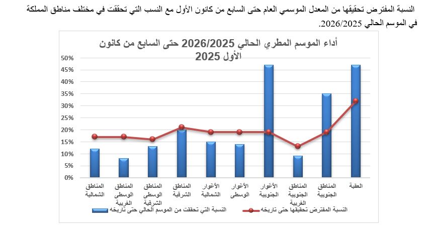 وبالاطلاع على أداء الموسم المطري الحالي حتى تاريخ اليوم فإن الأداء المطري هو اعلى من المفترض في المناطق الجنوبية بما فيها الاغوار الجنوبية والعقبة والذي تراوح ما بين (148%-246%)، فيما كان الأداء المطري جيداً وحول معدله في باقي مناطق المملكة باستثناء المناطق الوسطى الغربية والتي لا يزال فيها الأداء المطري ضعيف وبنسبة 48%.