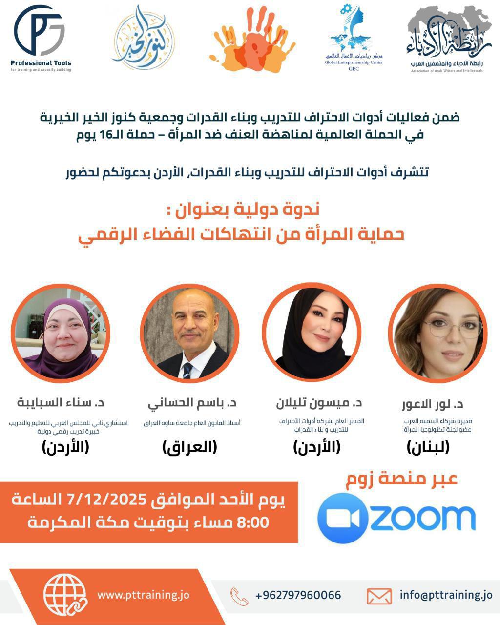عمون - نظّمت شركة أدوات الاحتراف للتدريب وبناء القدرات، بالتعاون مع جمعية كنوز الخير الخيرية ورابطة الأدباء والمثقفين العرب – الذراع الثقافي للشركة – وبالشراكة مع مركز رياديات الأعمال التابع للهيئة العالمية الأمريكية للاختراع والتنمية والاستثمار، ندوة دولية متخصصة حملت عنوان «حماية المرأة من انتهاكات الفضاء الرقمي»، وذلك في إطار فعاليات الحملة العالمية 16 يوم لمناهضة العنف ضد المرأة، وبمشاركة خبراء من العراق ولبنان والأردن.