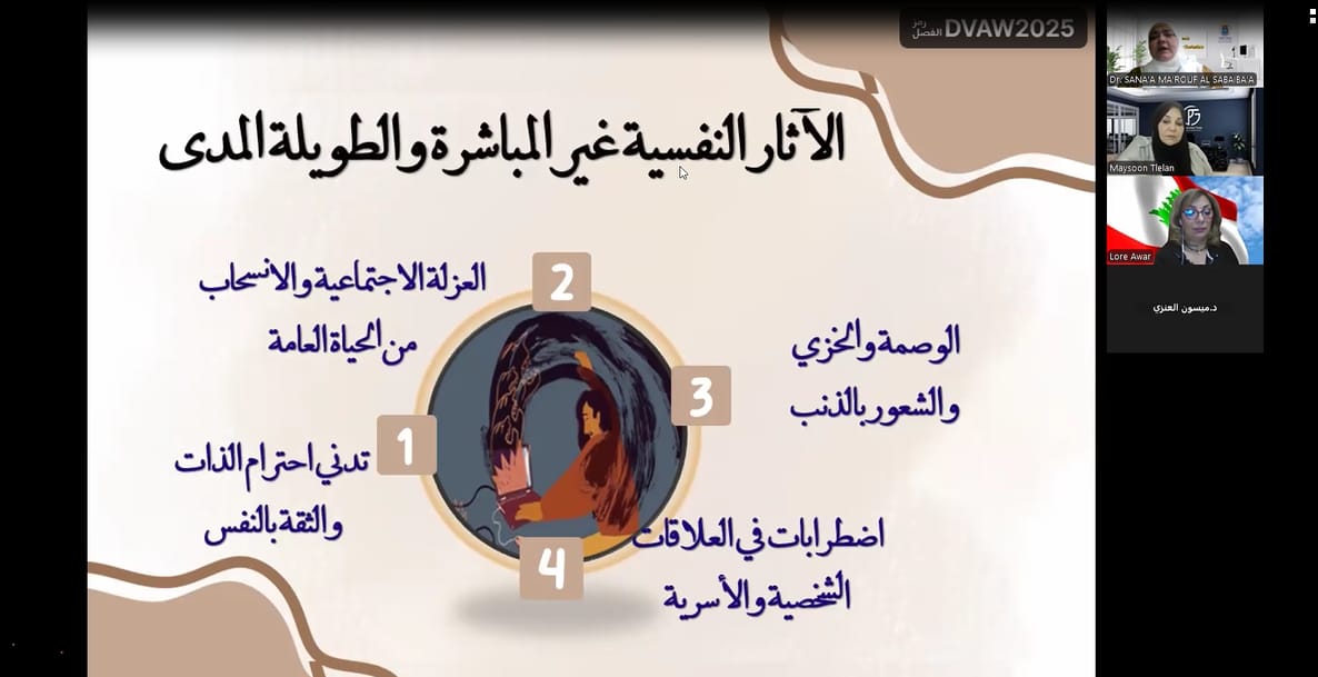 •الدكتورة سناء الحسين السبايبة التي عرضت التأثيرات النفسية والاجتماعية للعنف الإلكتروني، وأكّدت ضرورة توفير خدمات الدعم النفسي المتخصص للمتضررات واستراتيجيات الوقاية من العنف الرقمي ومواجهته .
