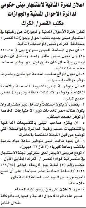 عطاء استئجار مبنى لدائرة الاحوال المدنية والجوازات لمكتب القصر