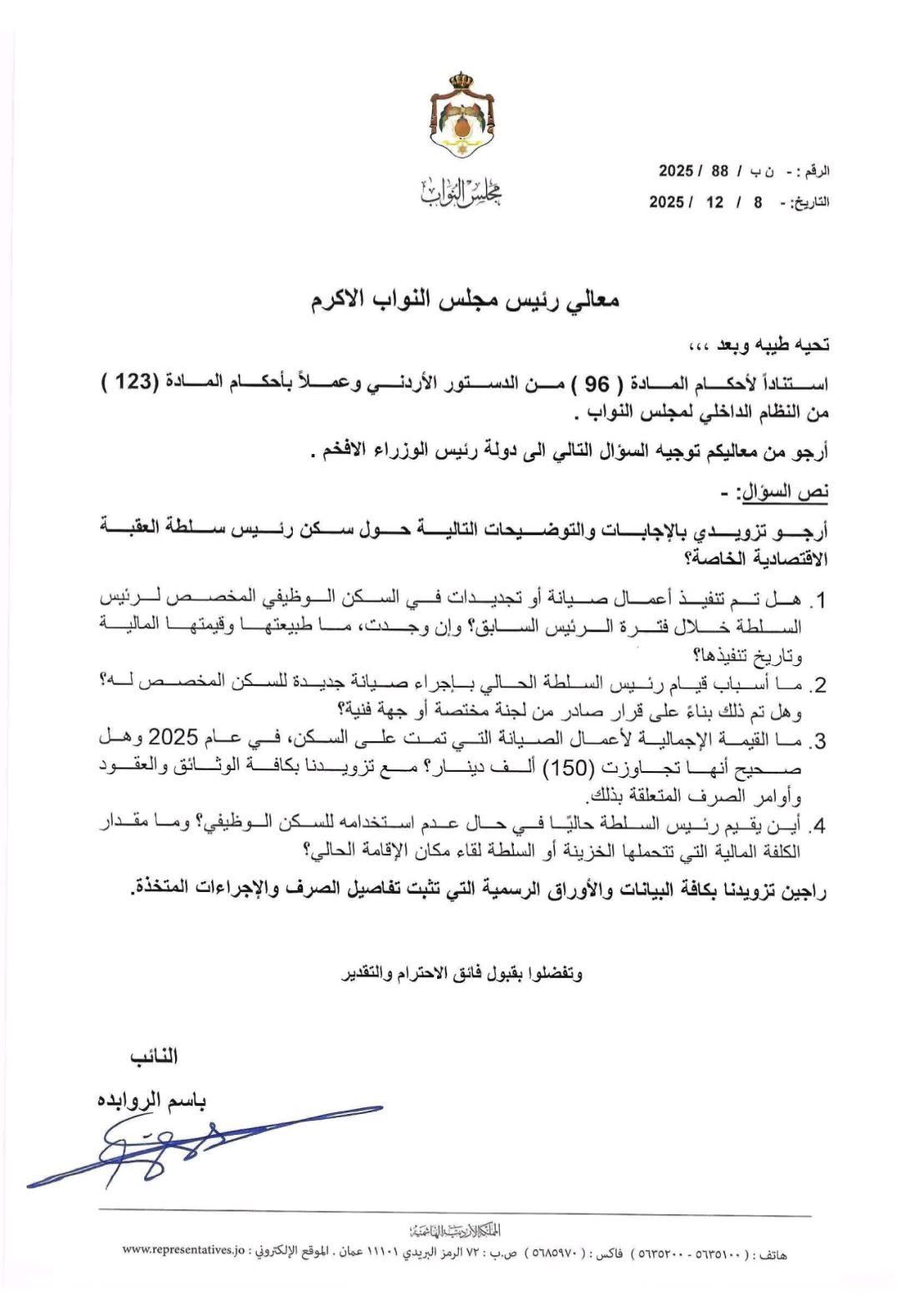 عمون - وجه النائب باسم الروابدة، سؤالا نيابيا إلى رئيس الوزراء، حول سكن رئيس سلطة العقبة الاقتصادية الخاصة.