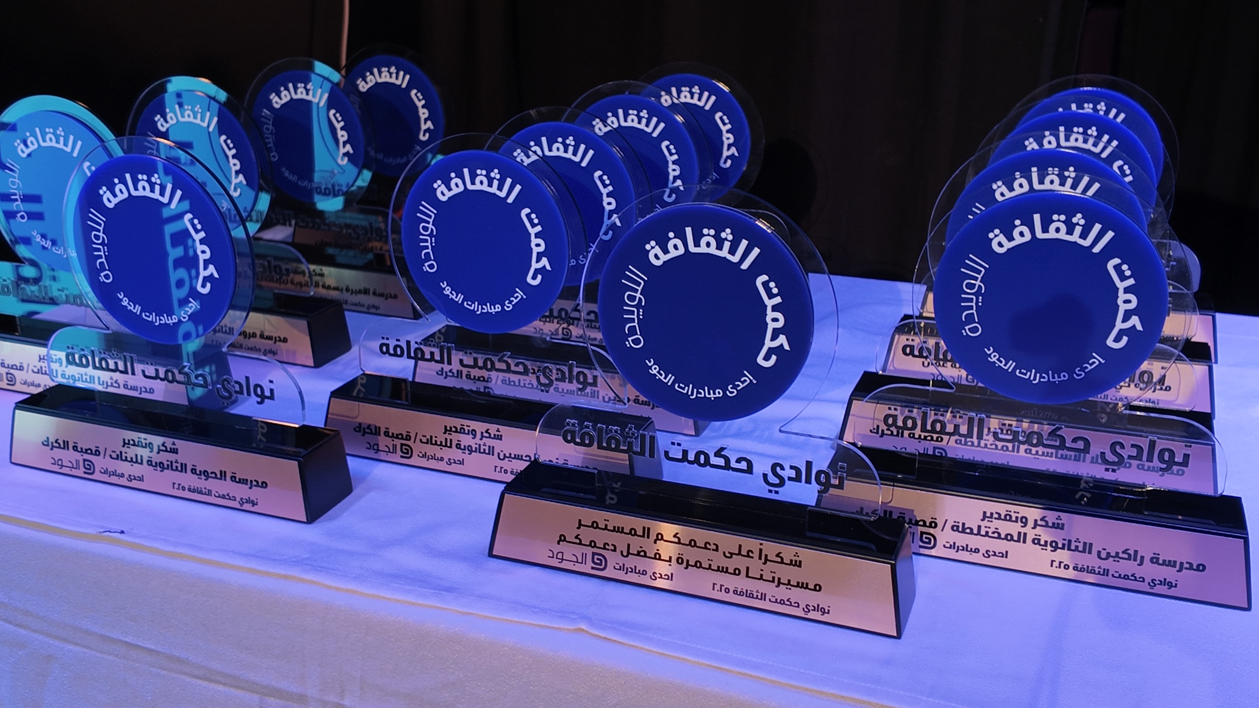 عمون - تحت رعاية عضو مجلس الأعيان هيفاء النجار، وبحضور مدير إدارة النشاطات الأستاذ عبد الحكيم الشوابكة، والأستاذة رانيا قسطنطين – المدير العام لمؤسسة الجود للرعاية العلمية، أقيم حفل تكريم المدارس الحكومية الفائزة بنوادي حكمت الثقافة 2025، التي أطلقتها مؤسسة الجود للرعاية العلمية يوم الأربعاء 10 كانون الأول 2025 على مسرح أسامة المشيني في جبل اللويبدة.