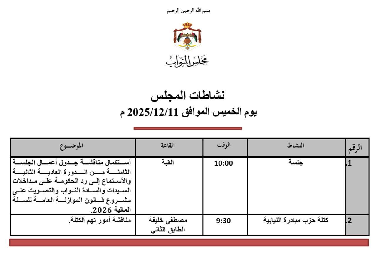 عمون - يصوت مجلس النواب، الخميس، على مشروع قانون الموازنة العامة للسنة المالية 2026 فصلًا فصلًا وفقا للدستور.