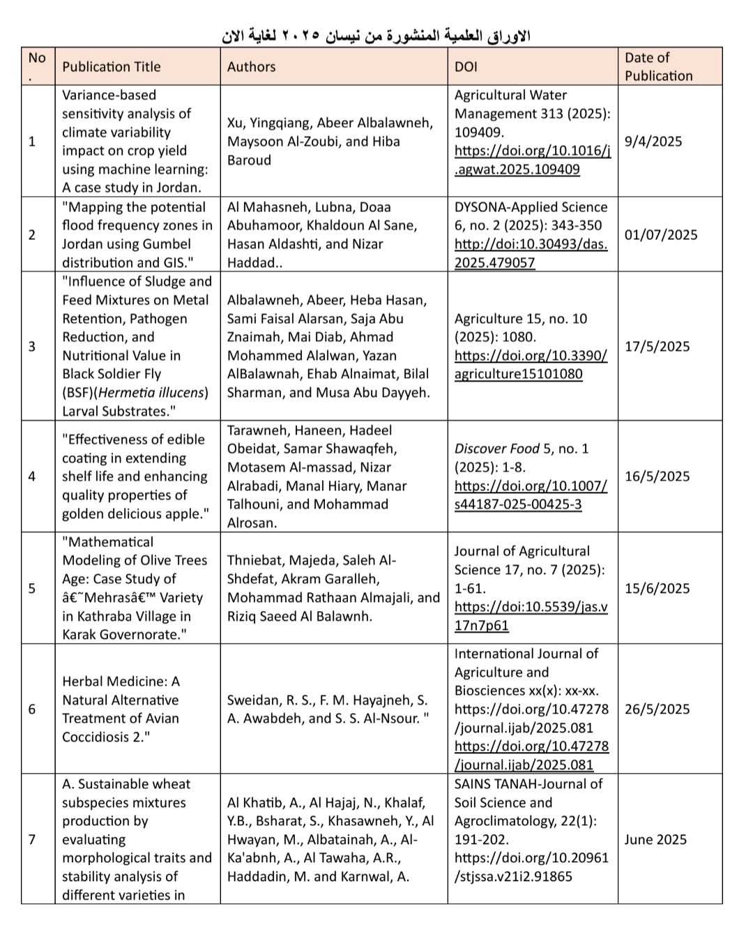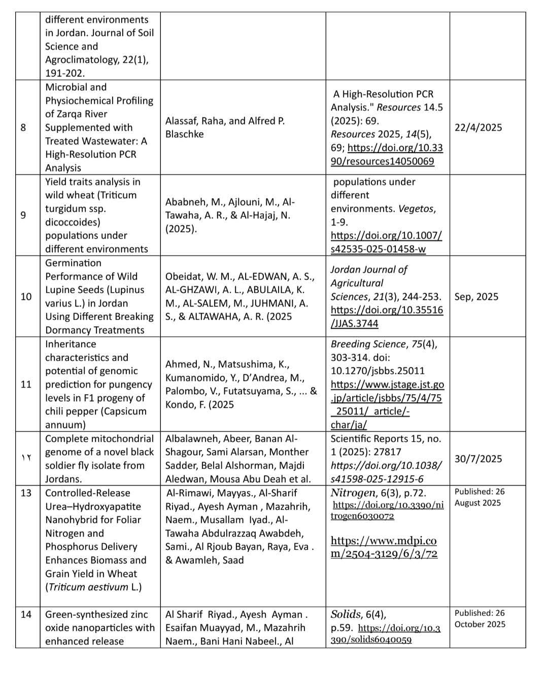 ووجّه الرواشدة شكره وتقديره للباحثين في المركز الوطني للبحوث الزراعية على جهودهم المتميزة، مؤكداً أن ما يقدّمونه من معرفة وإنتاج علمي يُسهم في إثراء المكتبات الوطنية والمؤسسات العلمية، ويعكس صورة مشرّفة للبحث العلمي في الأردن، ويساعد في تحقيق التنمية الزراعية المستدامة.
