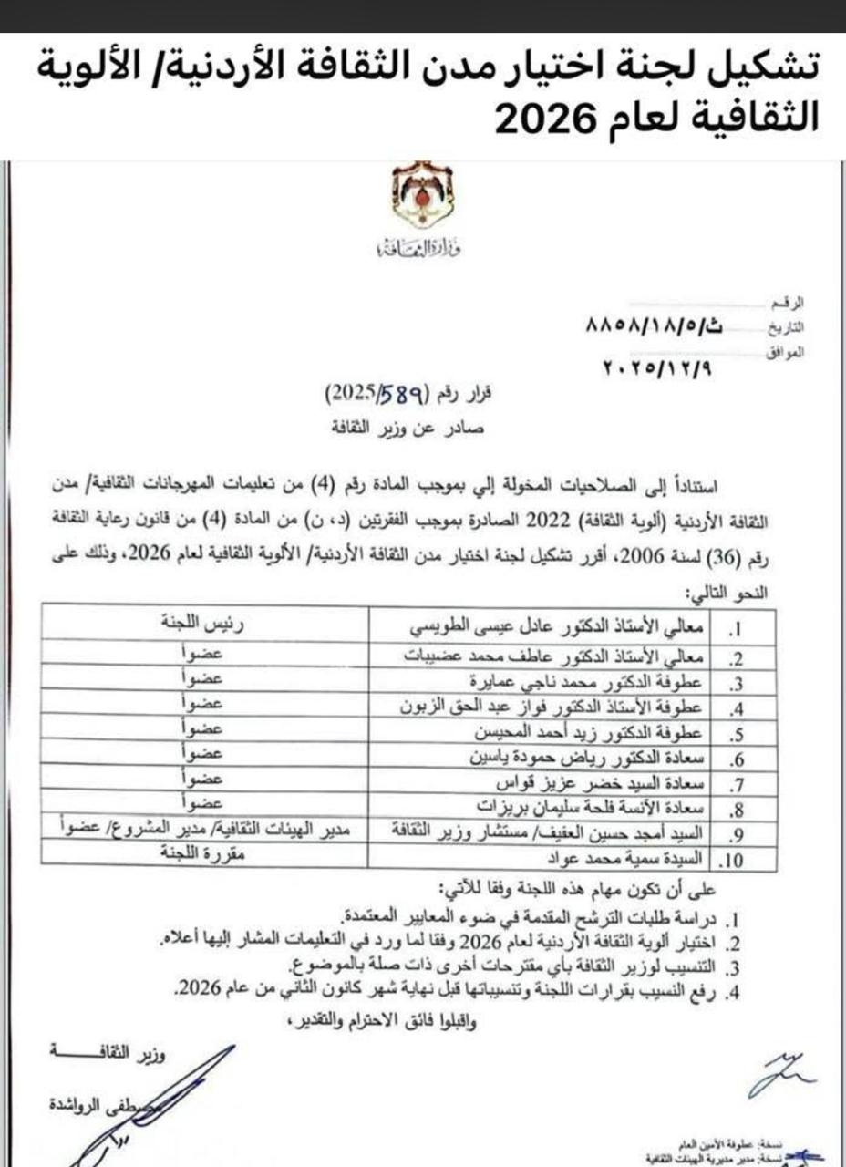 عمون - قرر وزير الثقافة مصطفى الرواشدة، تشكيل لجنة اختيار مدن الثقافة الأردنية/ الألوية الثقافية لعام 2026.