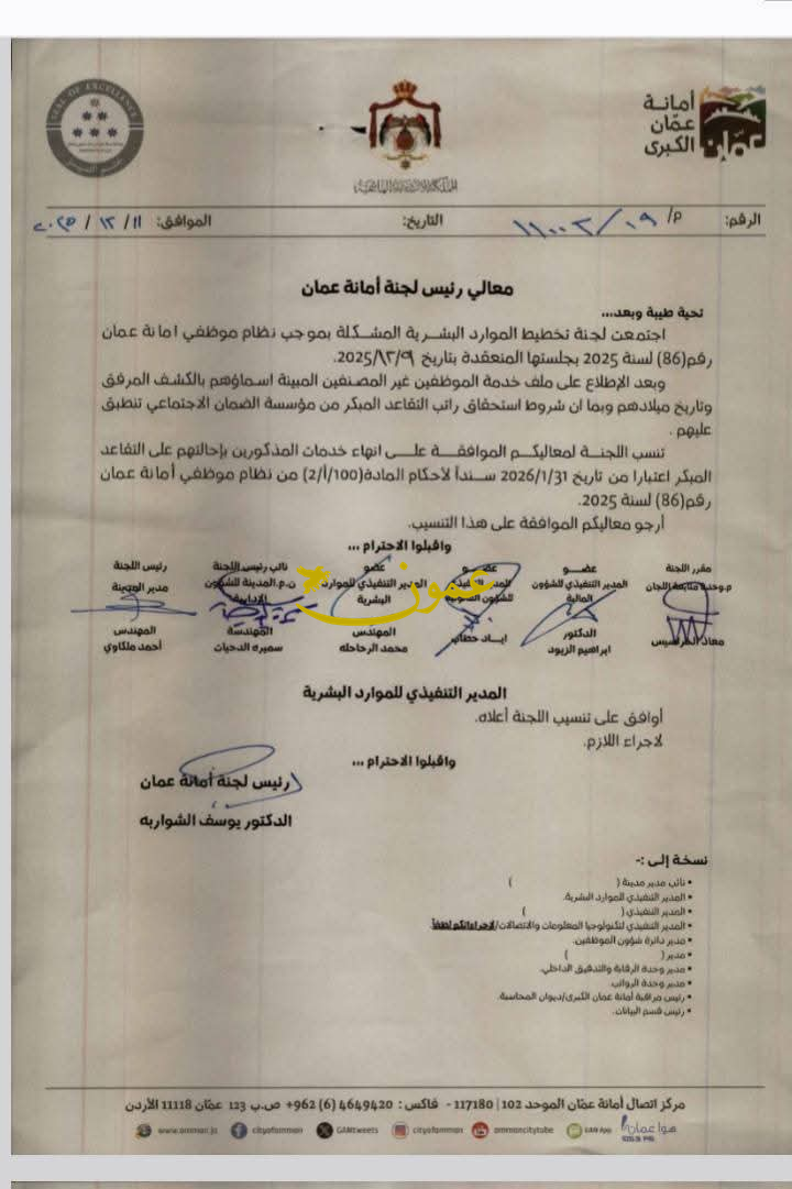 عمون -ينال المعاني- قرر رئيس لجنة أمانة عمان الكبرى الدكتور يوسف الشواربة، إحالة 8 من كبار موظفي الامانة الى التقاعد المبكر اعتبارا من تاريخ 31/1/2026. |