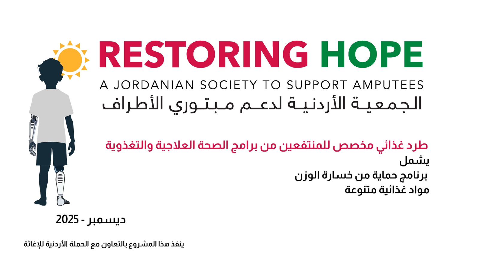 عمون - أطلقت الجمعية الأردنية لدعم مبتوري الأطراف الاصطناعية (استعادة الأمل) بالتعاون مع الحملة الأردنية للإغاثة برنامجاً صحياً وتغذوياً متكاملاً يستهدف المستفيدين من خدمات الجمعية في قطاع غزة.