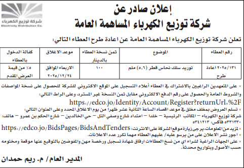 عطاء صادر عن شركة توزيع الكهرباء