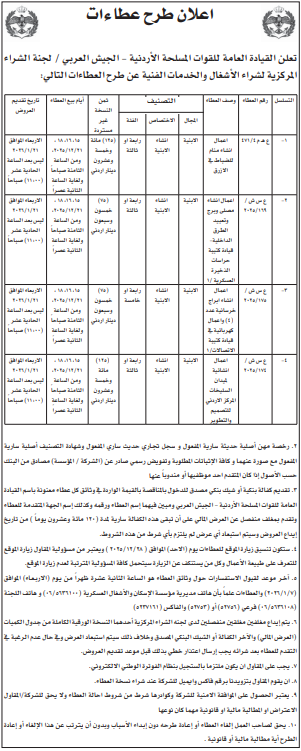 عطاءات صادرة عن القيادة العامة للقوات المسلحة الاردنية