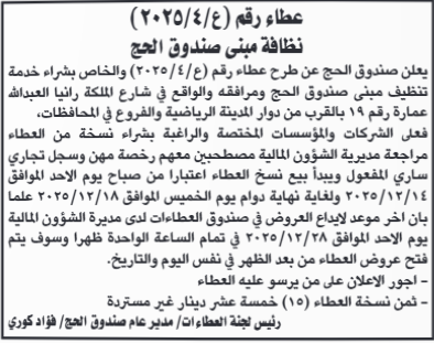 عطاء شراء خدمات التنظيف لمبنى صندوق الحج