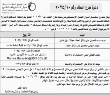 عطاء صادر عن صندوق استثمار اموال الضمان الاجتماعي