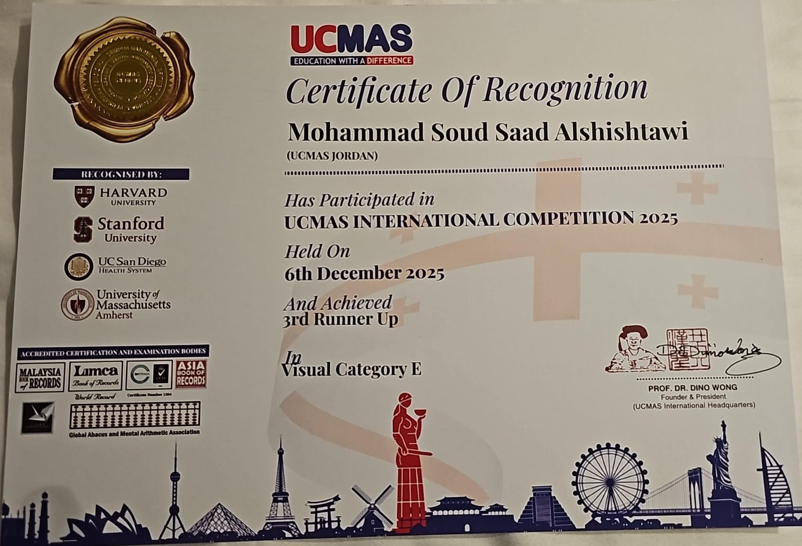 عمون - فاز الطالب الأردني محمد سعود الششتاوي (10 سنوات) بالمرتبة الثالثة 3rd Runner Up عالميًا الوصيف الثالث Visual Category E ضمن فئته في الحساب الذهني – UCMAS، وذلك في بطولة العالم للحساب الذهني UCMAS التي جرت في مدينة تبليسي، عاصمة جورجيا، بمشاركة أكثر من 1500 مشترك من 82 بلدًا حول العالم. |