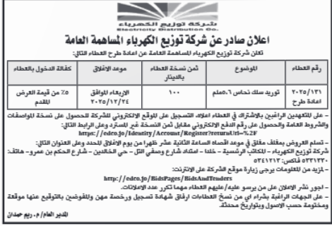 عطاء صادر عن شركة توزيع الكهرباء