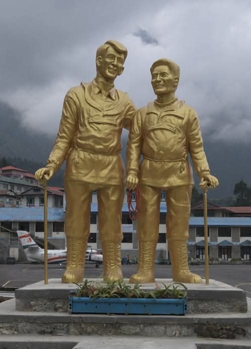 وكان قد وصل إيفرست المغامر إدموند هيلاري برفقة مرشده المستكشف النيبالي تينزينغ نورغاي عام 1953 فاتحًا الأفق لهذا المجهول والطريق لمغامري العالم، وقد جُسّد لهما تمثال ذهبي في بلدة لوكلا، نقطة بداية الطريق إلى مخيم القاعدة الشهير قرب واحد من أخطر مطارات العالم، حيث كنا يومًا هناك حاملين علم الوطن ورسالة إنسانية.