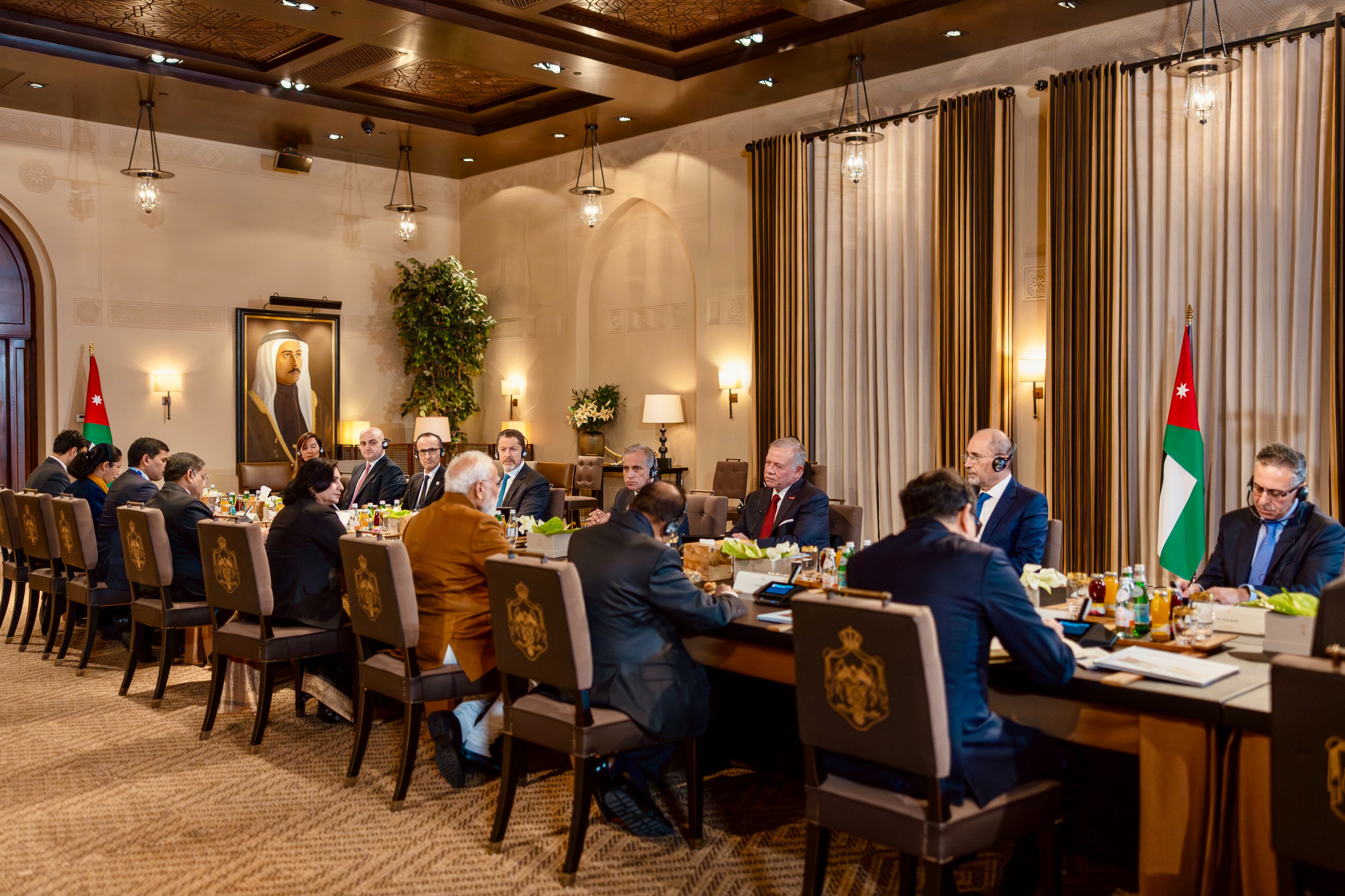 وحضر المباحثات نائب رئيس الوزراء ووزير الخارجية وشؤون المغتربين أيمن الصفدي، ومدير مكتب جلالة الملك، المهندس علاء البطاينة، ووزير الصناعة والتجارة والتموين المهندس يعرب القضاة، رئيس بعثة الشرف المرافقة للضيف، والسفير الهندي لدى الأردن مانيش تشوهان، والوفد المرافق للضيف